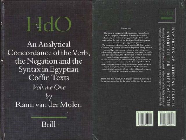 Molen, van der, R. 2005. An analytical concordance of the verb, the negation and the syntax in Egyptian Coffin Texts. Two volumes. – Leiden, Brill (Handbuch der Orientalistik, Section One. The Near and Middle East 77)